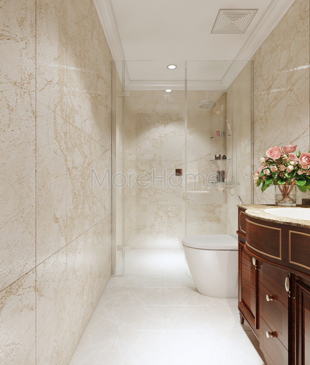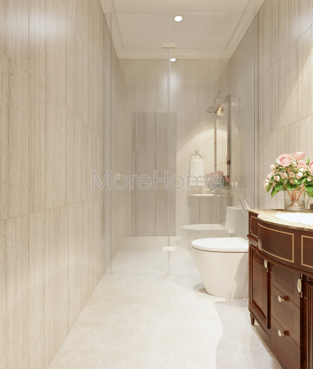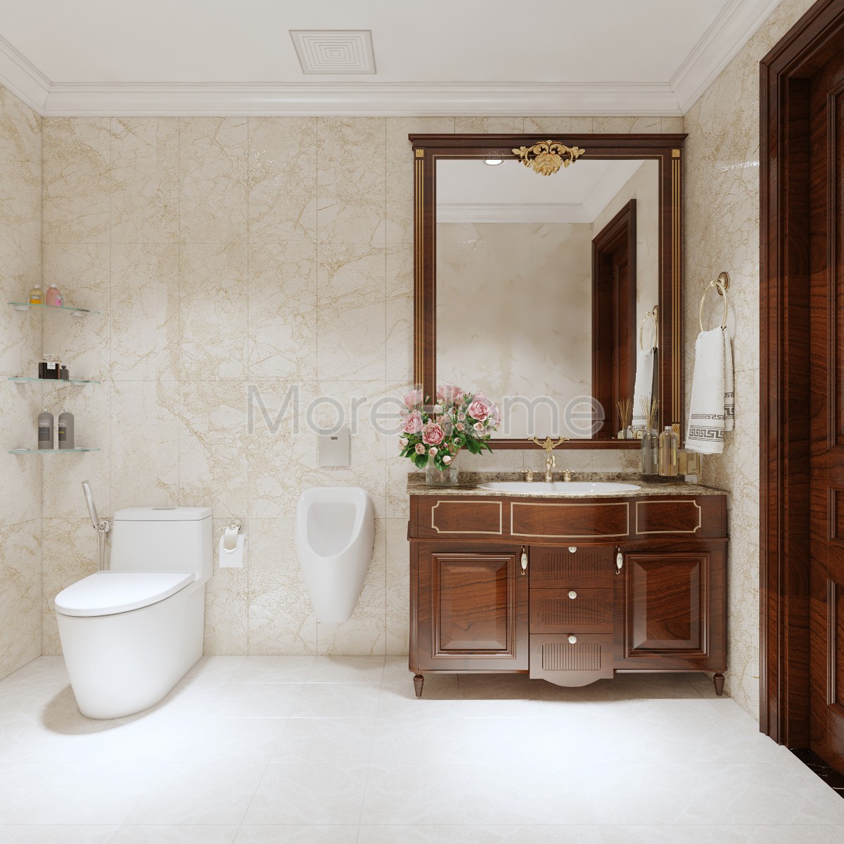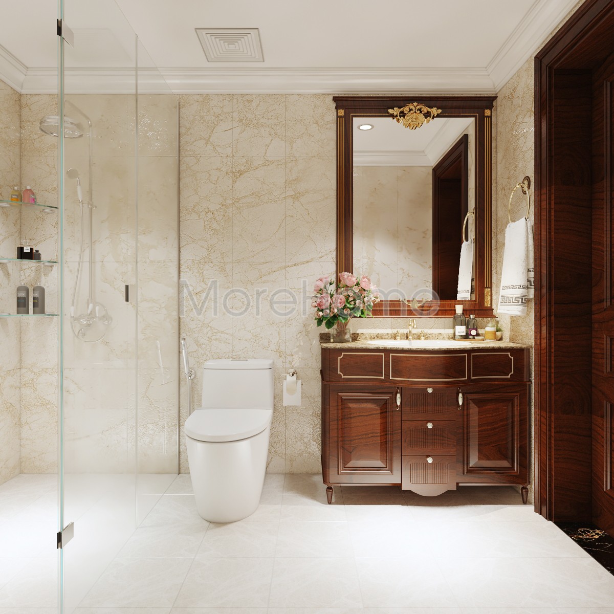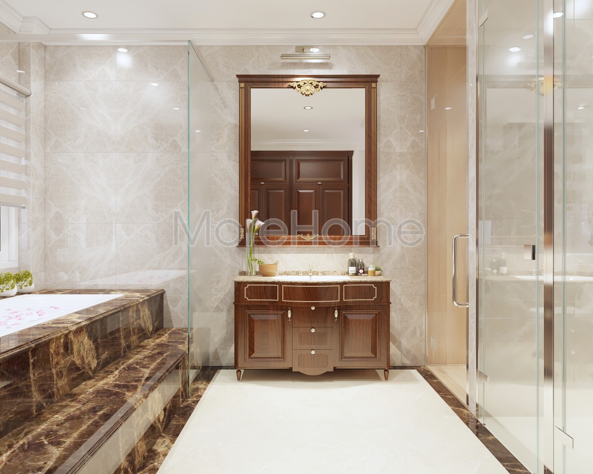 Thiết kế nội thất luôn mang đến sự hiện đại và tiện nghi nhất định. Đối với phòng tắm cũng vậy, được thiết kế với mẫu thiết bị vệ sinh và hệ tủ đồ gỗ tạo cho gia chủ có được không gian thư giãn tuyệt vời sau một ngày dài làm việc.