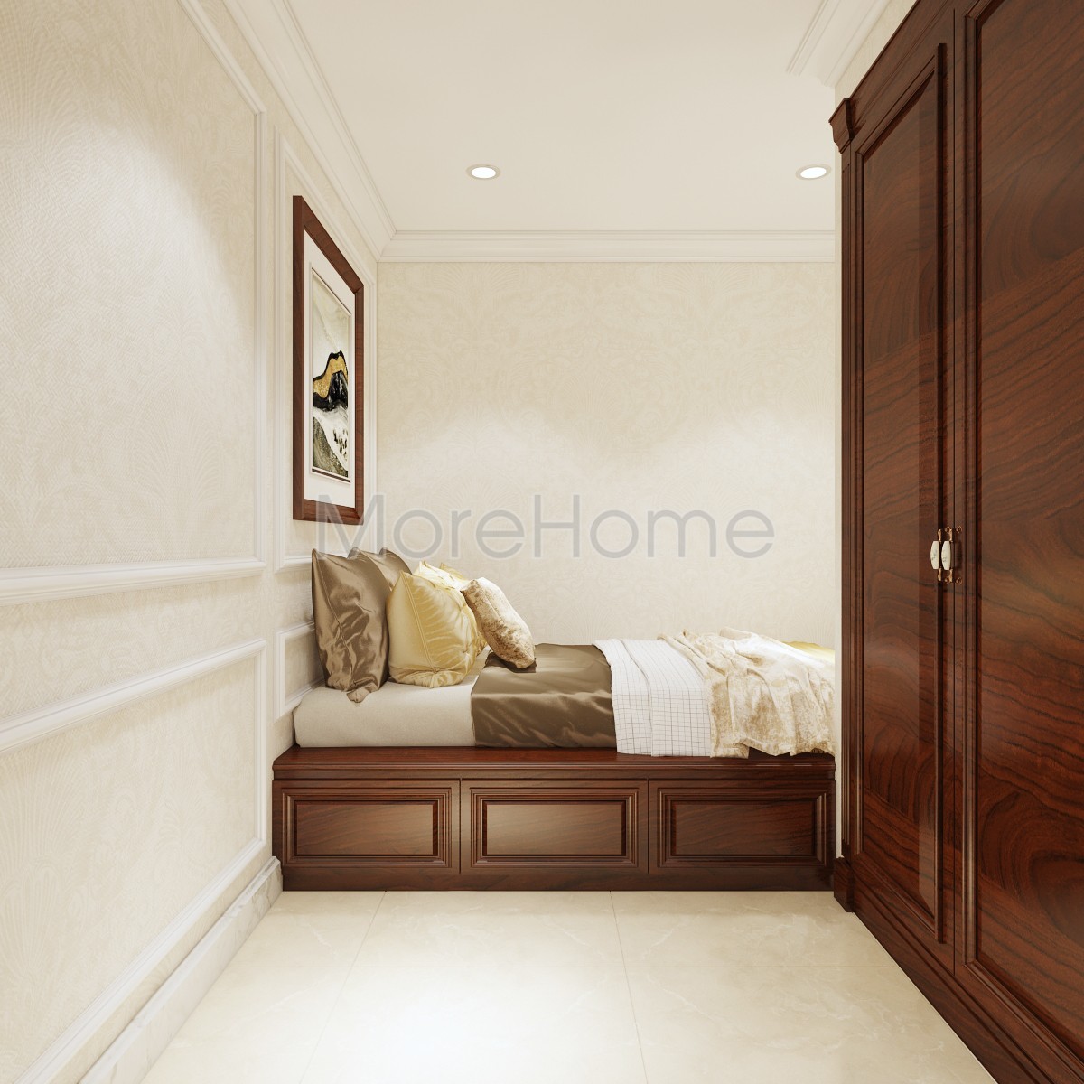 Thiết kế phòng ngủ con đơn giản với chiếc giường gỗ thông minh. Mẫu giường gỗ đa năng có các ngăn để đồ ở bên thành giường giúp tiết kiệm không gian cho căn phòng. Tủ đồ được lựa chọn ở đây là mẫu tủ kín cửa mở, thể hiện được phong cách tân cổ điển.