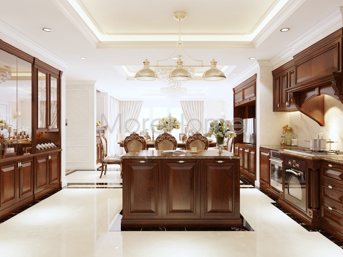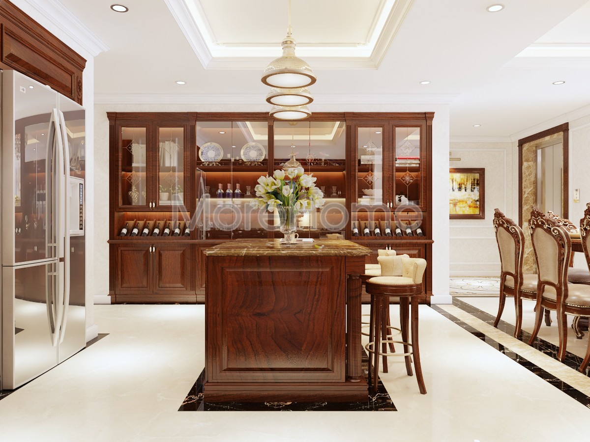 Thiết kế phòng bếp cổ điển với đảo bếp dài và chiếc ghế bar sang trọng. Bộ tủ bếp kín bằng gỗ được mang đến sự gọn dang, đa năng cho không gian bếp. Bên cạnh không gian nấu nướng gia chủ muốn đặt thêm kệ tủ rượu để tiện cho việc tiếp khách khi cần thiết. Hệ tủ bếp gỗ tựn nhiên màu nâu socola được sử dụng tạo sự thận thiện và ấm cúng cho căn phòng bếp.