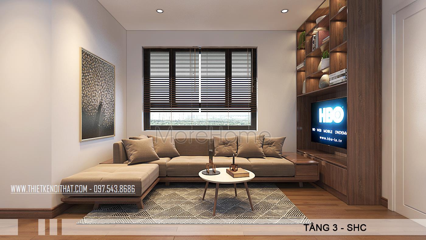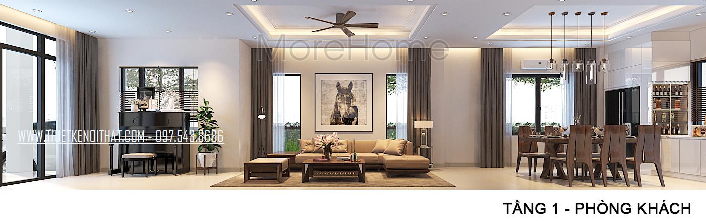 Nhìn vào không gian phòng khách này bạn có thể thấy được sự tối giản trong thiết kế của KTS Morehome. Phòng khách ngôi biệt thự có diện tích rộng, có độ thông thoáng cao nên các KTS đã lựa chọn một bộ sofa gỗ óc chso có kích thước lớn, được thiết kế tối giản các chi tiết rườm rà tạo nên vẻ đẹp hiện đại và vô cùng sang trọng.