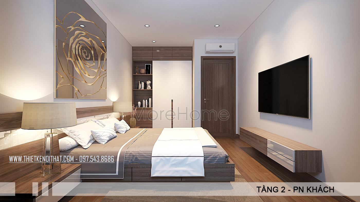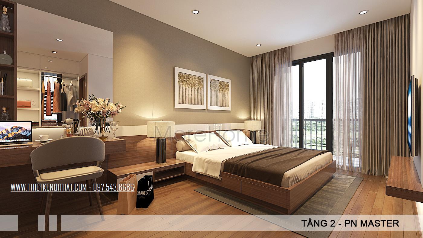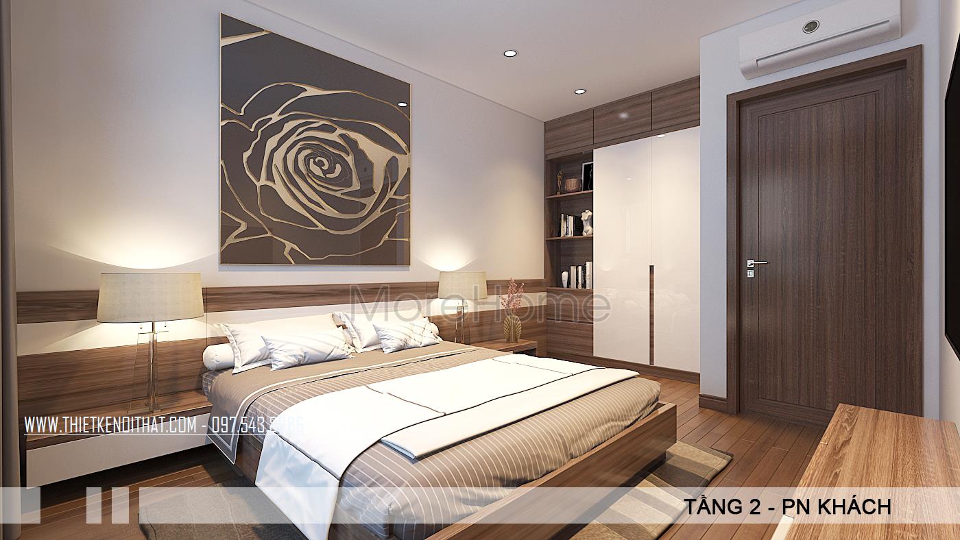 Phòng ngủ được thiết kế với mẫu giường gỗ óc chó cao cấp, thông minh giúp cho gia chủ có được giấc ngủ ngon. Nó còn mang lại vẻ đẹp tinh tế cho không gian phòng ngủ. Hệ tủ và kệ trang trí cũng được sử dụng chất liệu gỗ óc chó để tạo nên sự đồng nhất về màu sắc cho căn phòng.