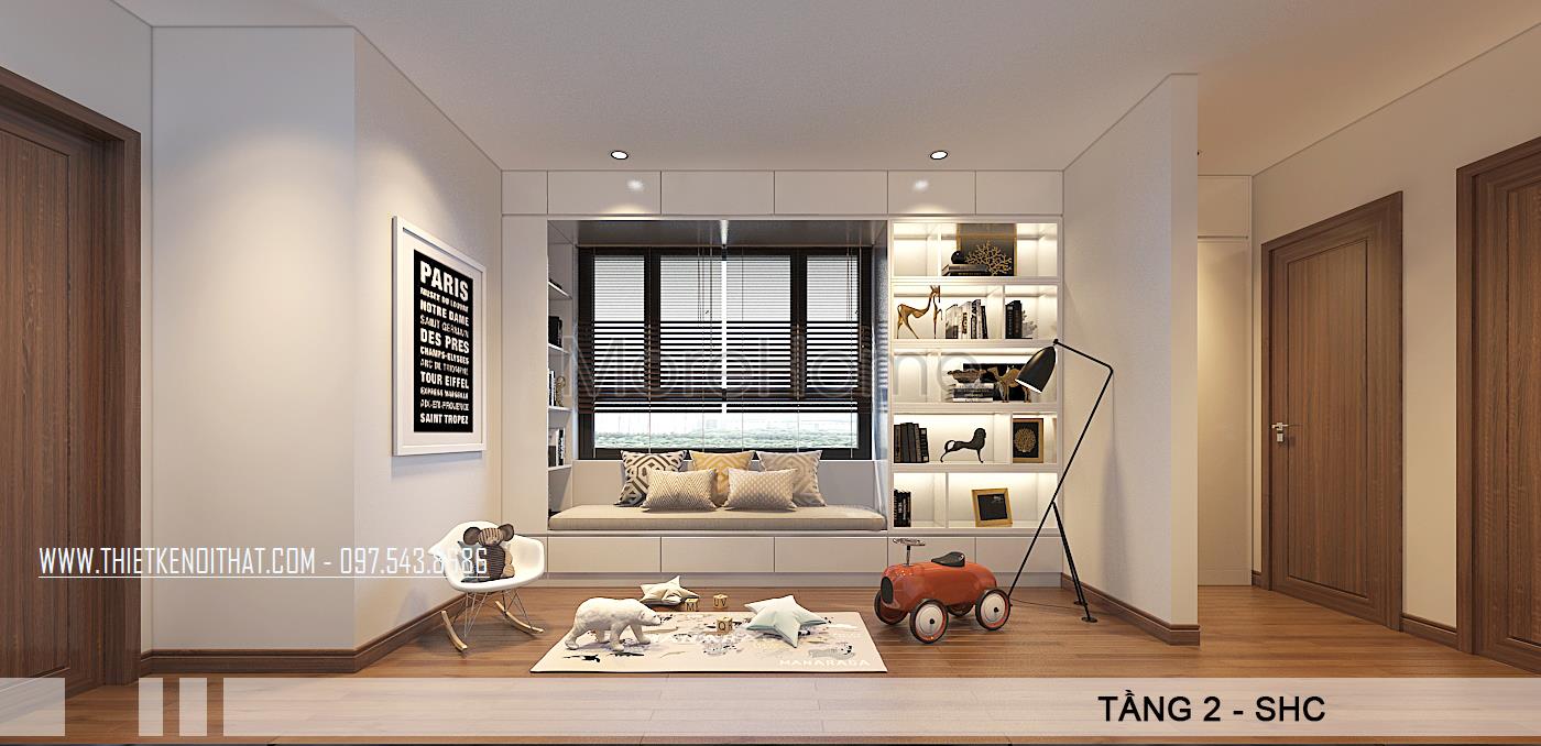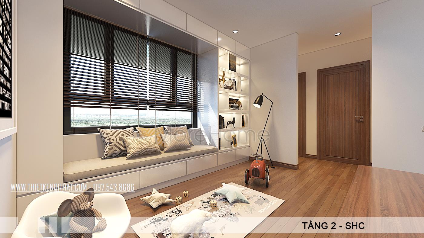 Phòng ngủ con gái do thiết kế theo sở thích vì thế chất liệu đồ nội thất và màu sắc được thiết kế khác biệt với hệ thống căn nhà. Phòng ngủ bé được lựa chọn tông màu chủ đạo là màu hồng và chất liệu gỗ công nghiệp. Từ chiếc giường đến kệ sách bàn học, ghế bàn trang điểm đều tông màu hồng nhạt và làm bằng chất liệu gỗ công nghiệp hiện đại và thông minh.