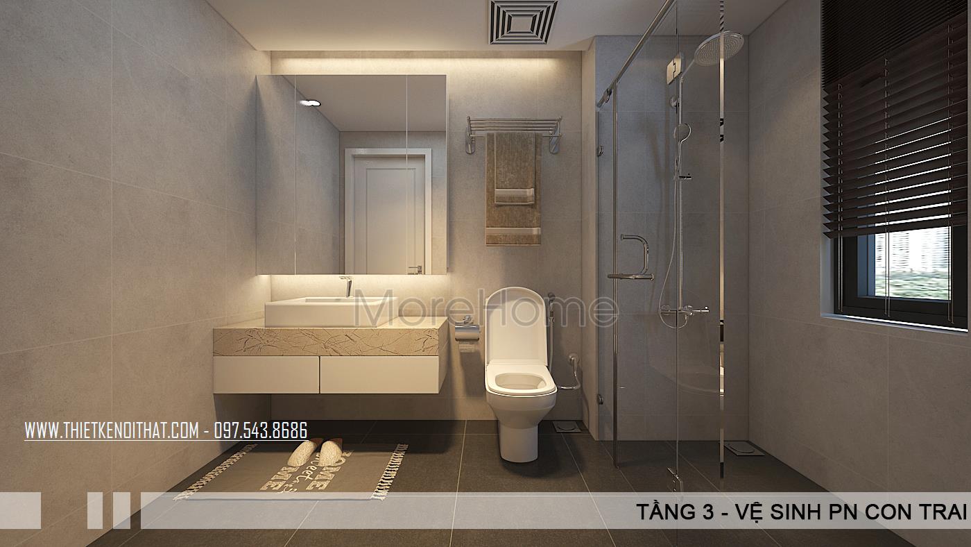 Thiết kế phòng tắm đơn giản, tinh tế và tiện nghi với vách kính phòng tắm và thiết bị vệ sinh hiện đại. Mang đến người dùng cảm giác thư thái nhất.