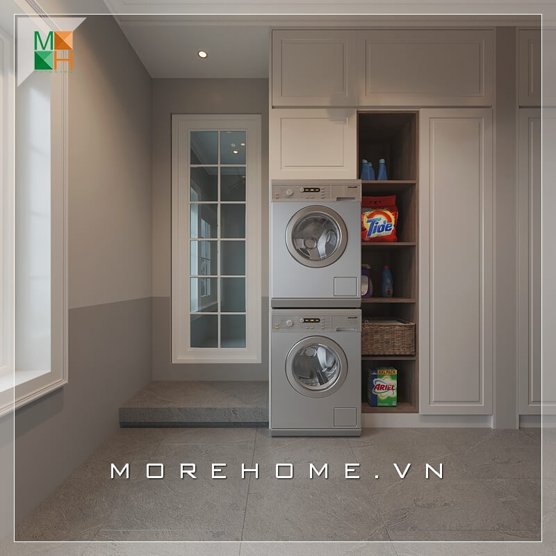 Hệ thống tủ hiện đại trong thiết kế phòng giặt tiện lợi tạo nên một không gian ngăn nắp, gọn gàng đúng đẳng cấp của biệt thự