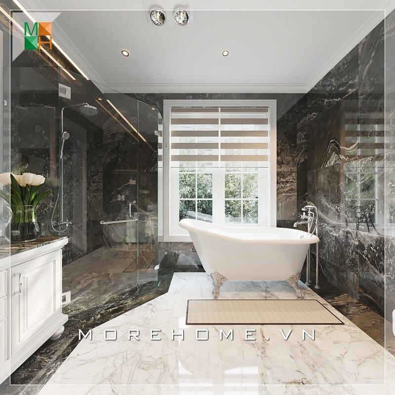 Phòng tắm biệt thự, nhà phố đẹp ấn tượng và sang trọng khi sử dụng vách kính ngăn hiện đại và đá ốp cao cấp.
