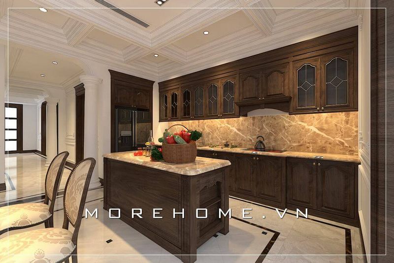 Thiết kế nội thất phòng bếp biệt thự gỗ tự nhiên sang trọng và đẳng cấp
