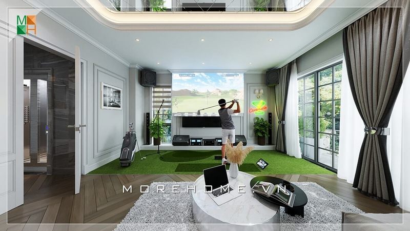 Với việc bố trí sân golf và sofa vải tiện lợi ngay trong phòng làm việc để gia chủ có thể thư giãn và sáng tạo là ý tưởng độc đáo của thiết kế biệt thự, nhà phố}.