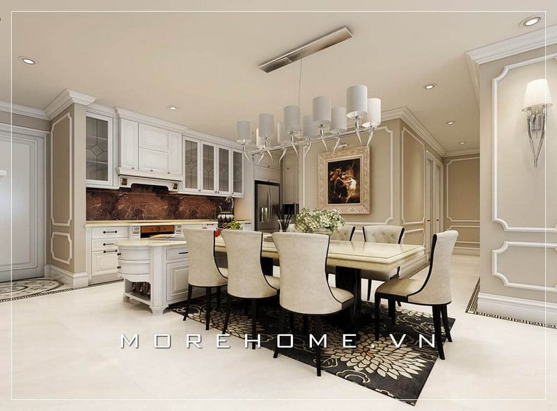 Thiết kế nội thất phòng ăn liền bếp tân cổ điển sang trọng, tiện nghi