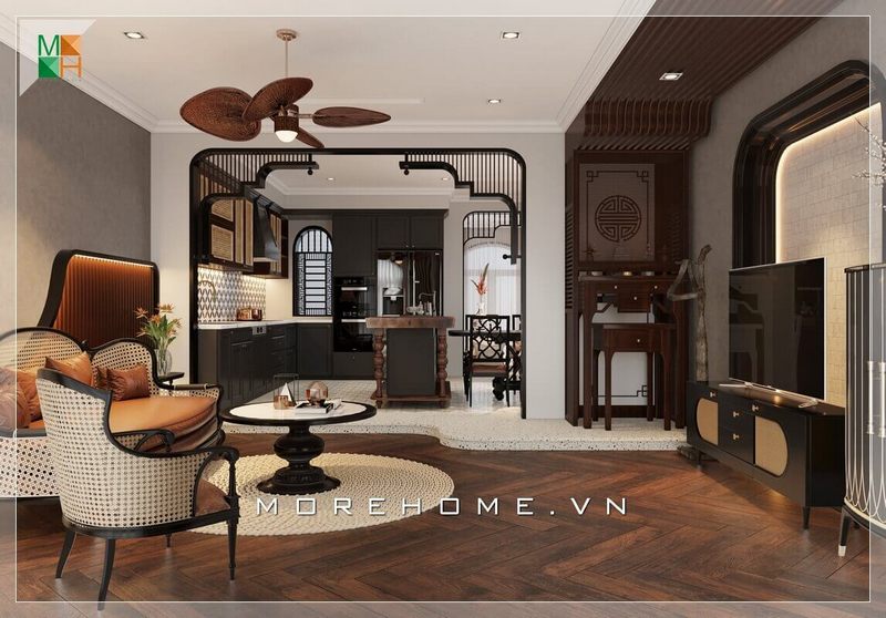 Ý tưởng trang trí không gian phòng khách nhà phố tân cổ điển sang trọng với nội thất gỗ tự nhiên và mảng tường sau tivi ốp đá cao cấp tạo nên sự độc đáo và ấn tượng ở nơi tiếp khách