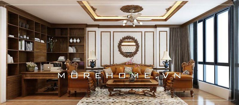 Nội thất tân cổ điển từ gỗ óc chó cao cấp tạo nên bộ sofa sang trọng nổi bật trong không gian phòng khách của biệt thự, nhà phố